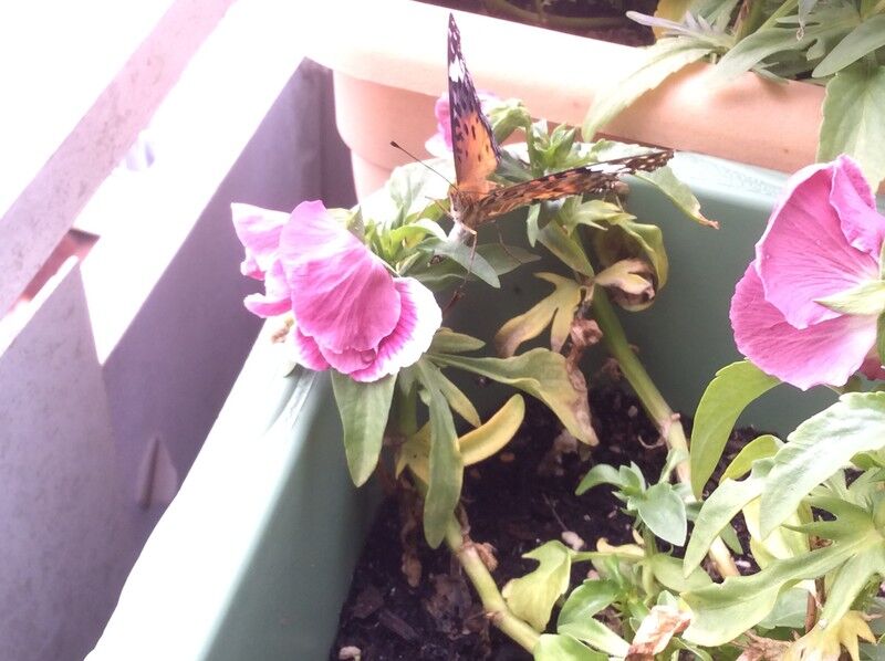 パンジーのプランターに、ツマグロヒョウモンのメスが