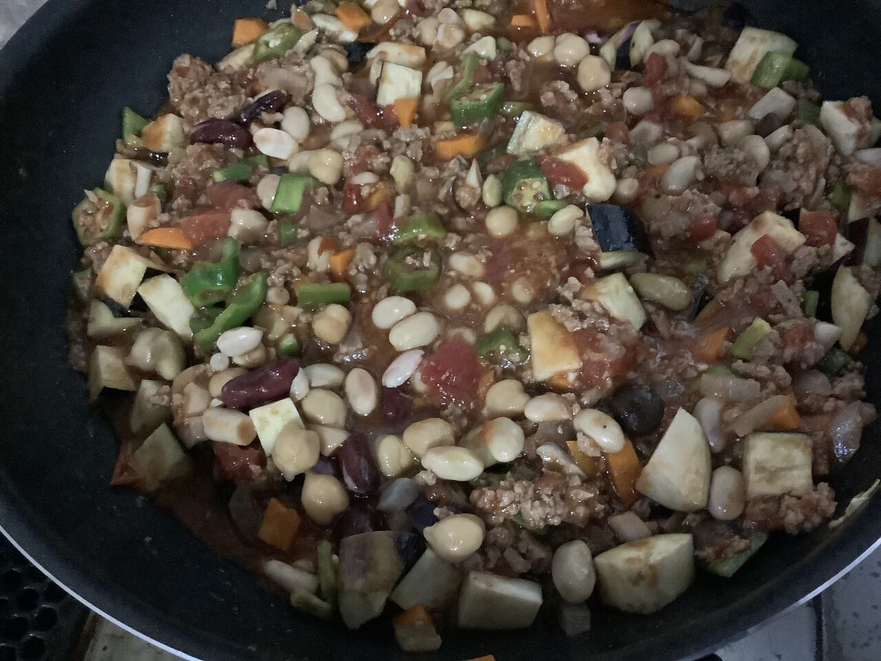 7種類の野菜とミックスビーンズ、ひき肉入り。