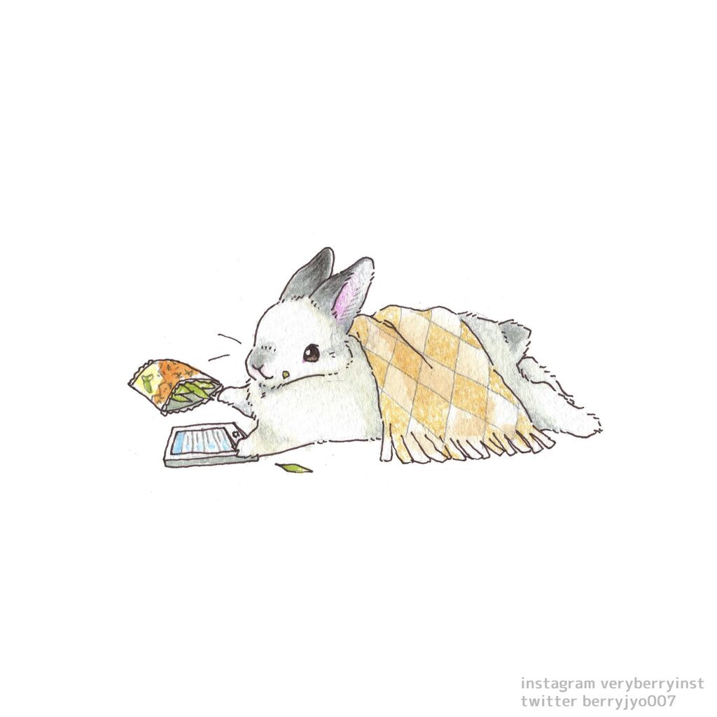 チモシーのおやつを食べながら寝転がってスマホ見てるうさぎさん。