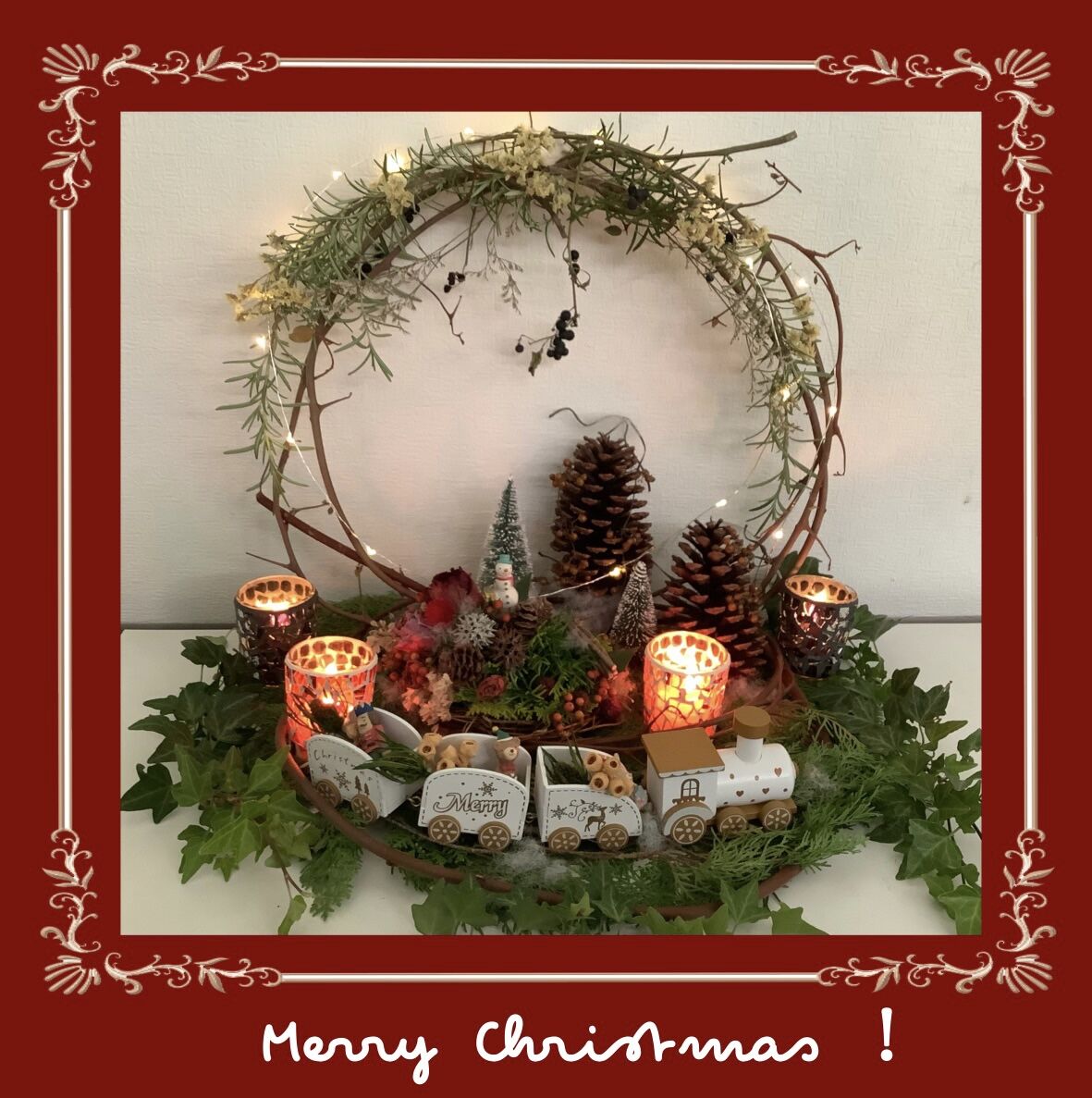 最初に載せたお飾りは、写真を加工してクリスマスカードにどうかな。