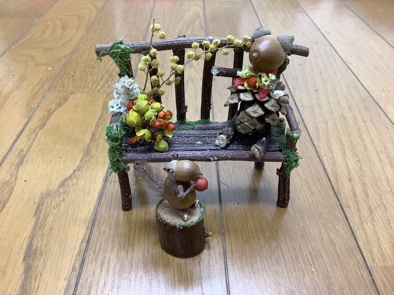 ダンボールの土台をリボンで巻いて、木の実をぎっしりくっつけて。