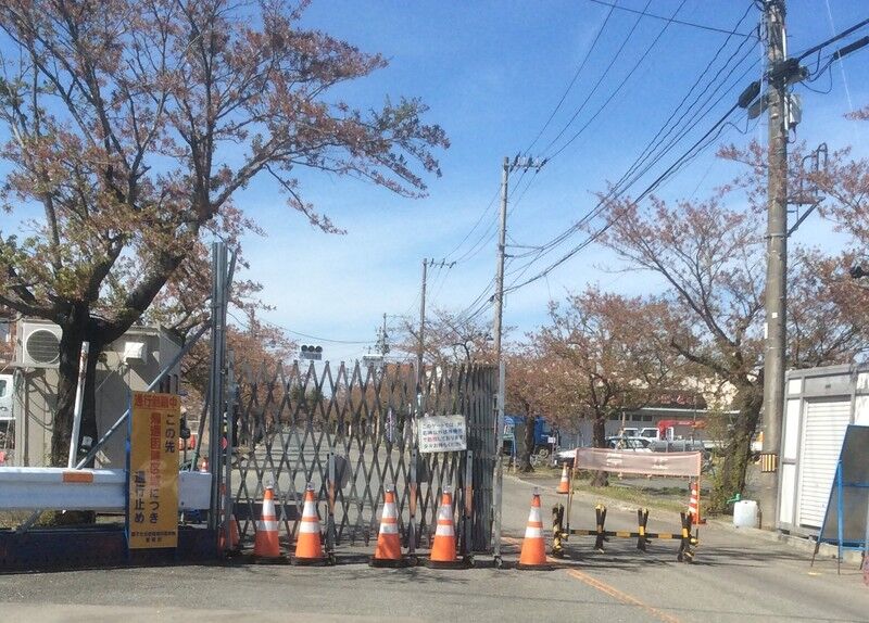 バリケードは長い桜並木にあります。このずっと奥が第二原発です。