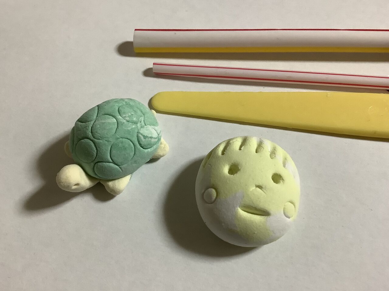 粘土に色を混ぜて、ニスなしで仕上げます。
