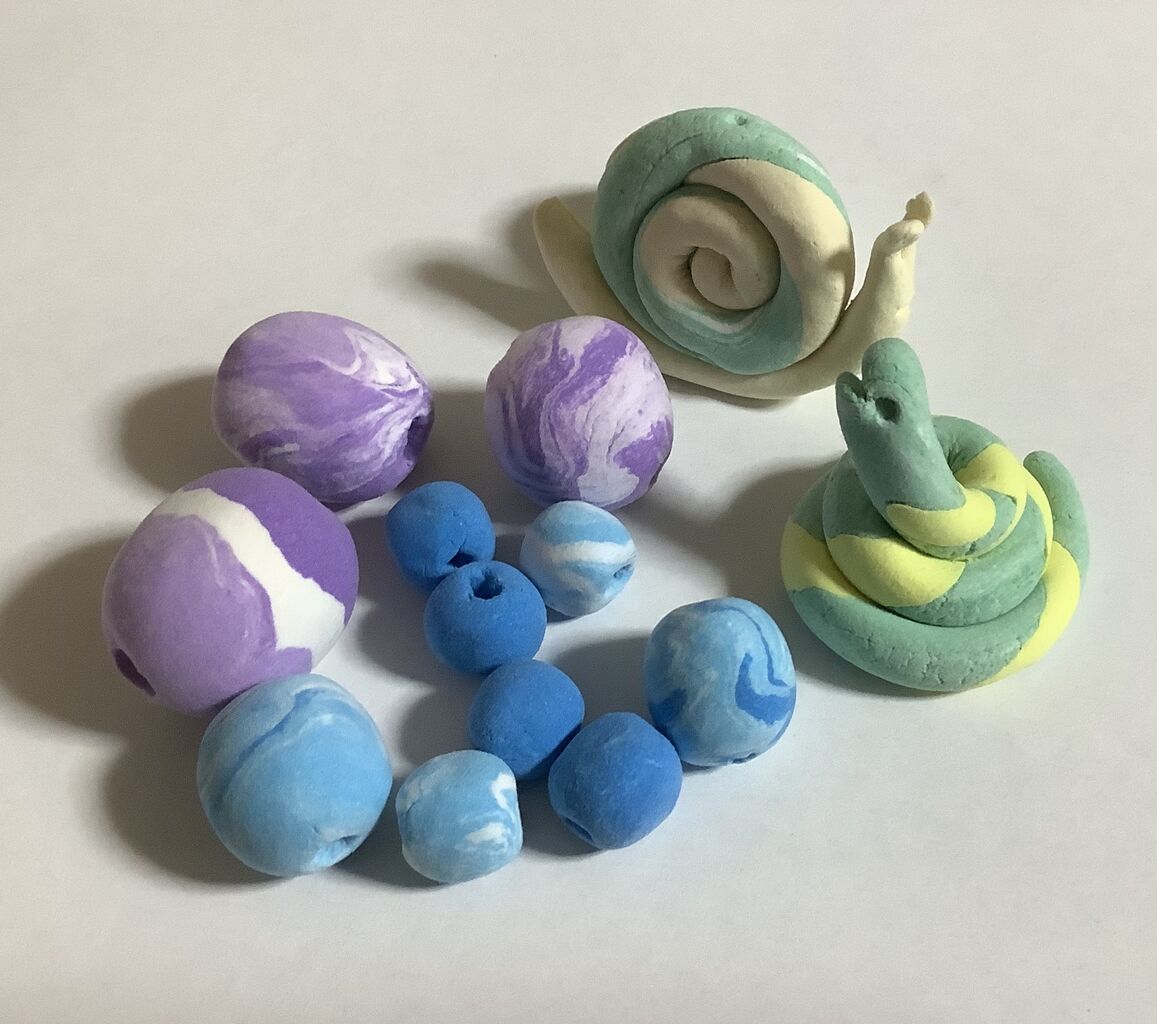 ついでに作ったトンボ玉と、ヘビとカタツムリ。