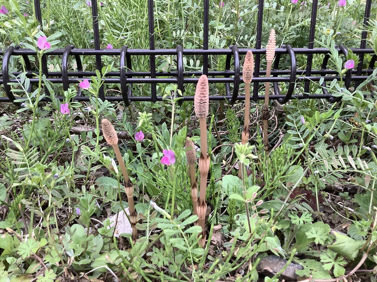 メドーセージの葉っぱの中に咲く、ピンクのハルジオンに癒されました。